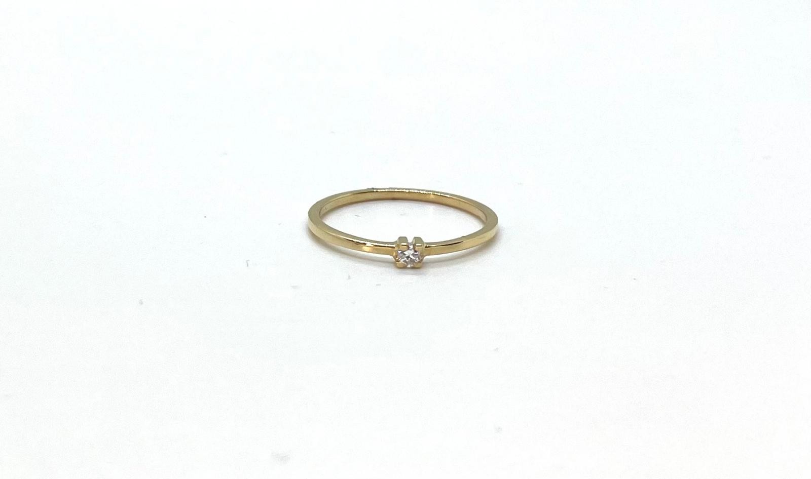 Elegant anell solitari d’or groc de 18 quirats amb diamant natural de 0,10 ct talla brillant, una joia clàssica i atemporal que destaca per la seva senzillesa i sofisticació. El diamant central, acuradament encastat, ofereix una brillantor intensa que captura la llum des de tots els angles.
