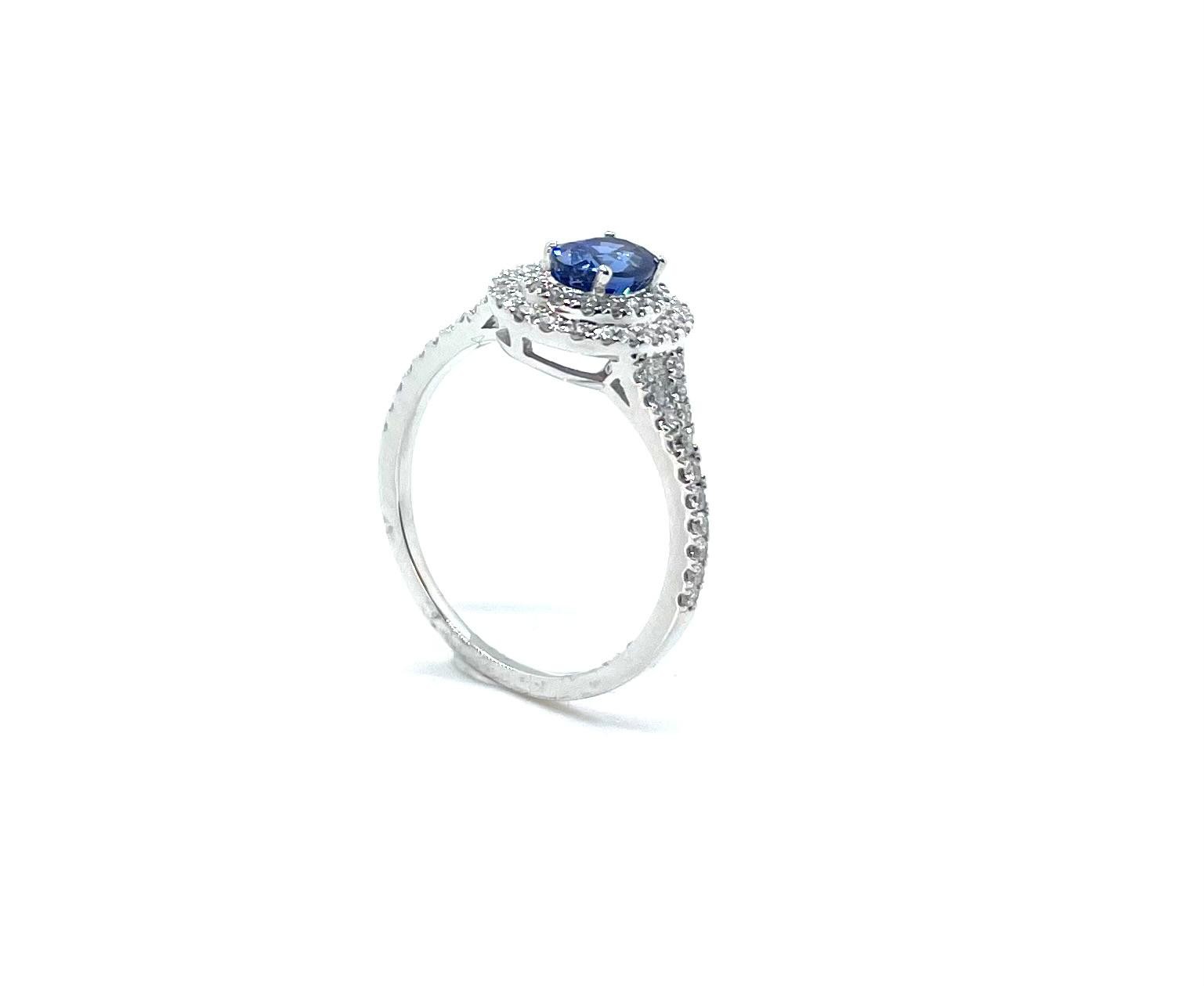 El safir està envoltat per un delicat halo de diamants naturals talla brillant, amb diamants addicionals al braç de l’anell que aporten una lluminositat excepcional. Els diamants tenen un pes total de 0,37 quirats, creant un contrast espectacular amb el blau profund del safir.