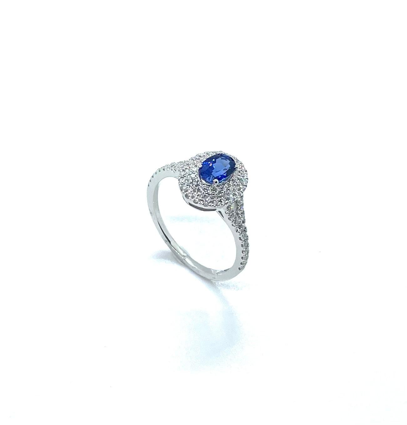 Elegant anell d’or blanc de 18 quirats amb un disseny sofisticat i ple de brillantor. La peça està protagonitzada per un safir blau natural talla oval de 0,81 quirats, que destaca pel seu intens color blau i la seva gran elegància.
