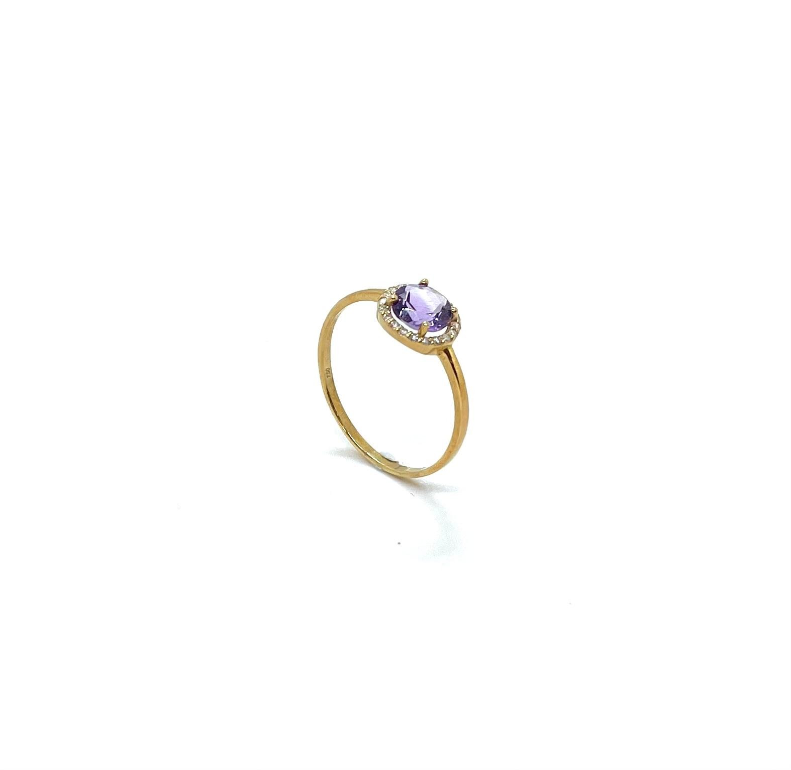 Elegant i delicat, aquest anell d’or groc de 18 quirats destaca per la seva ametista natural de tonalitat violeta situada al centre, que aporta llum i personalitat a la peça. Al seu voltant, un delicat halo de diamants naturals talla brillant accentua el color de la gemma i crea un joc de llum sofisticat.