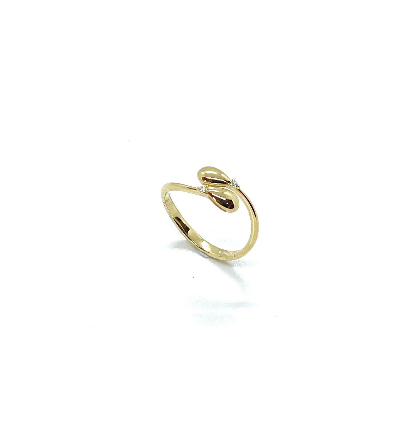 Elegant anell elaborat en or groc, amb un disseny modern i delicat que abraça el dit amb dues formes suaus i orgàniques. A cada extrem, el disseny incorpora dos diamants naturals talla brillant que aporten un toc de llum i sofisticació a la peça.