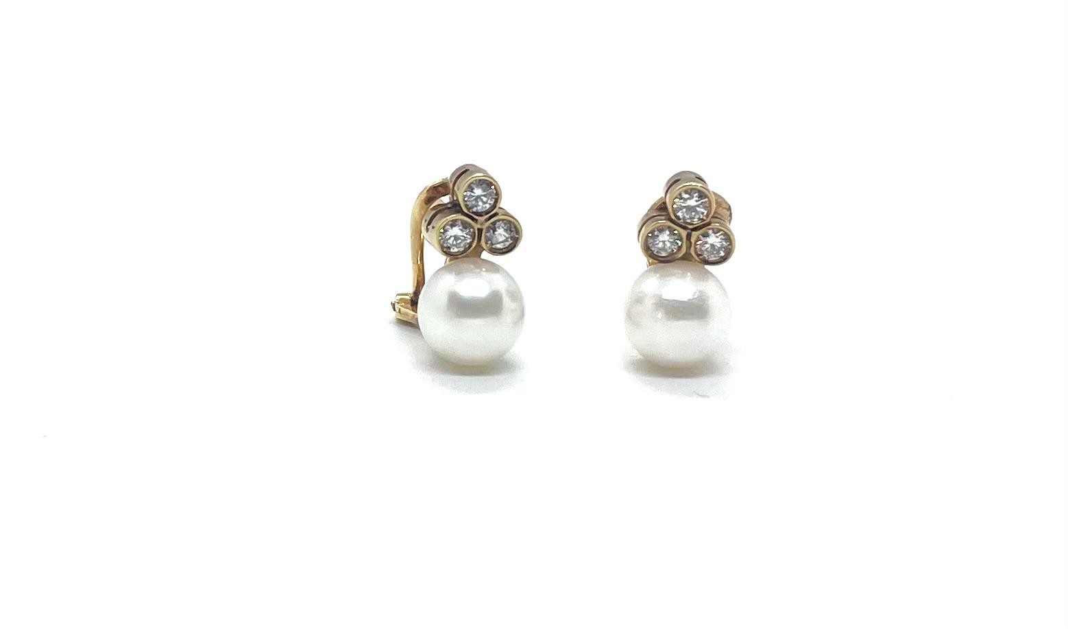 Elegants arracades d’or groc de 18 quirats amb diamants naturals talla brillant (0,18 ct cada arracada, total 0,36 ct) i perla natural esfèrica de 9 mm. El disseny amb tres diamants aporta una brillantor extra que realça la bellesa clàssica de la perla.