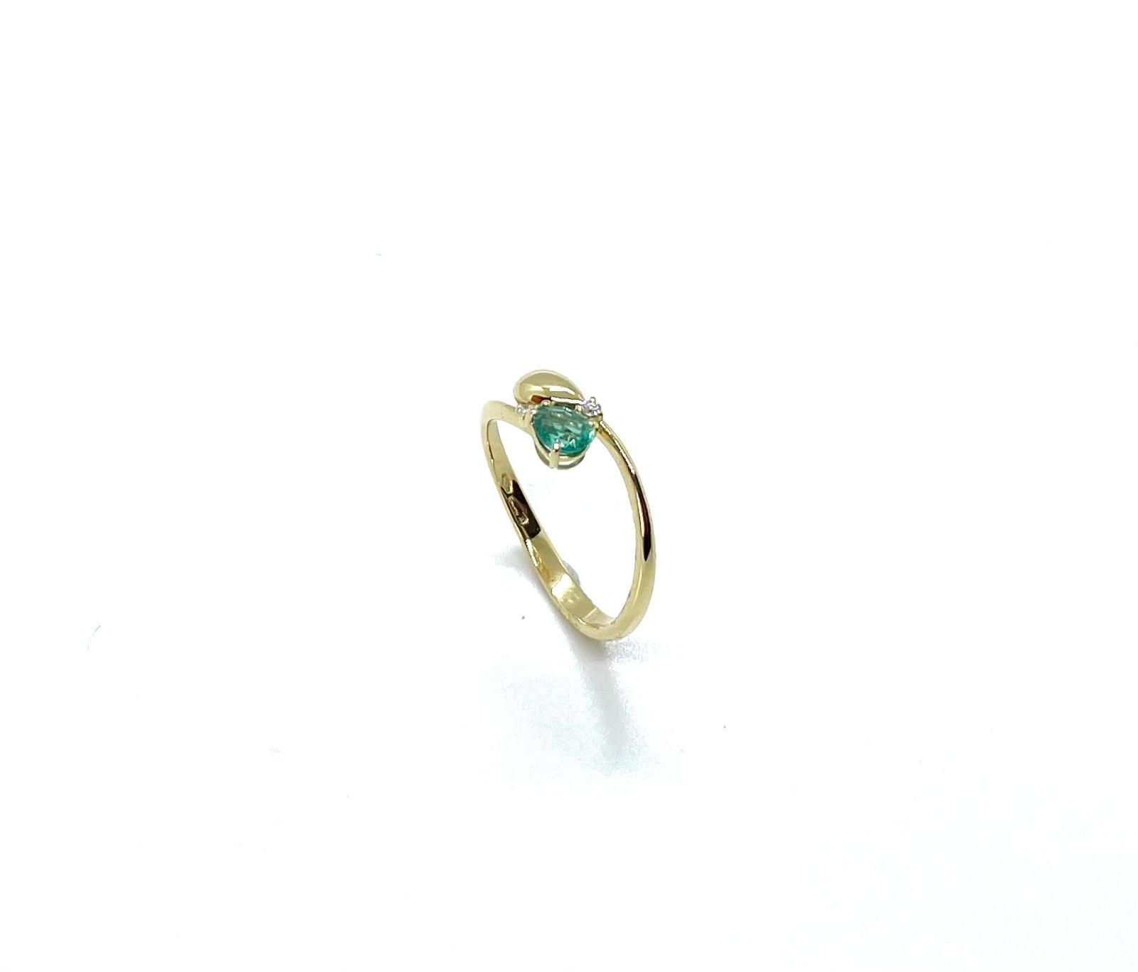 La peça està protagonitzada per una maragda natural talla pera de 0,30 ct, el seu intens color verd aporta frescor i sofisticació. La maragda s’acompanya de diamants naturals talla brillant amb un pes total de 0,02 ct, que afegeixen un subtil punt de llum i realcen el protagonisme de la gemma central.