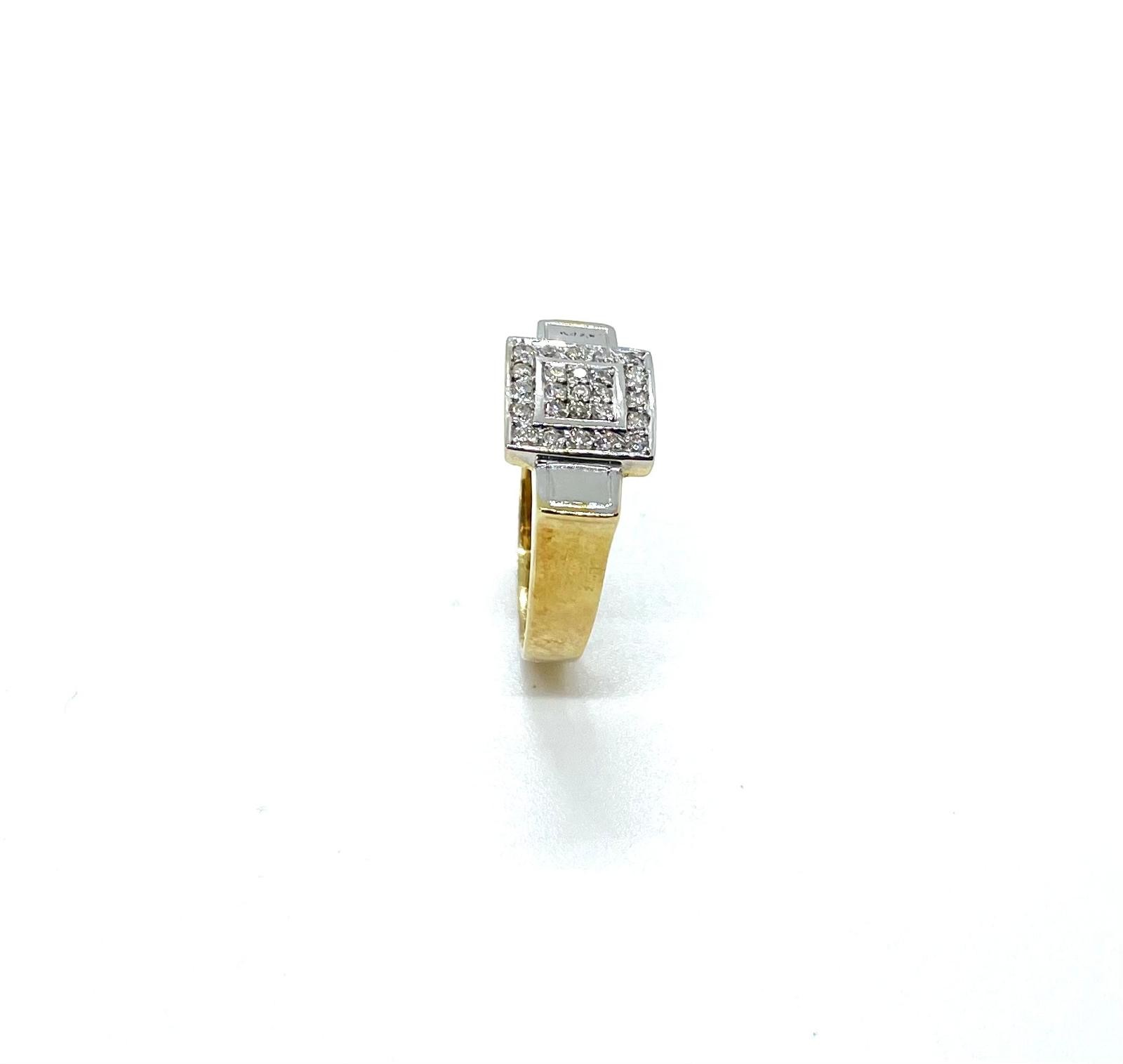 Elegante anillo elaborado en oro amarillo y oro blanco de 18 quilates, con un diseño geométrico y sofisticado que resalta el brillo de los diamantes.