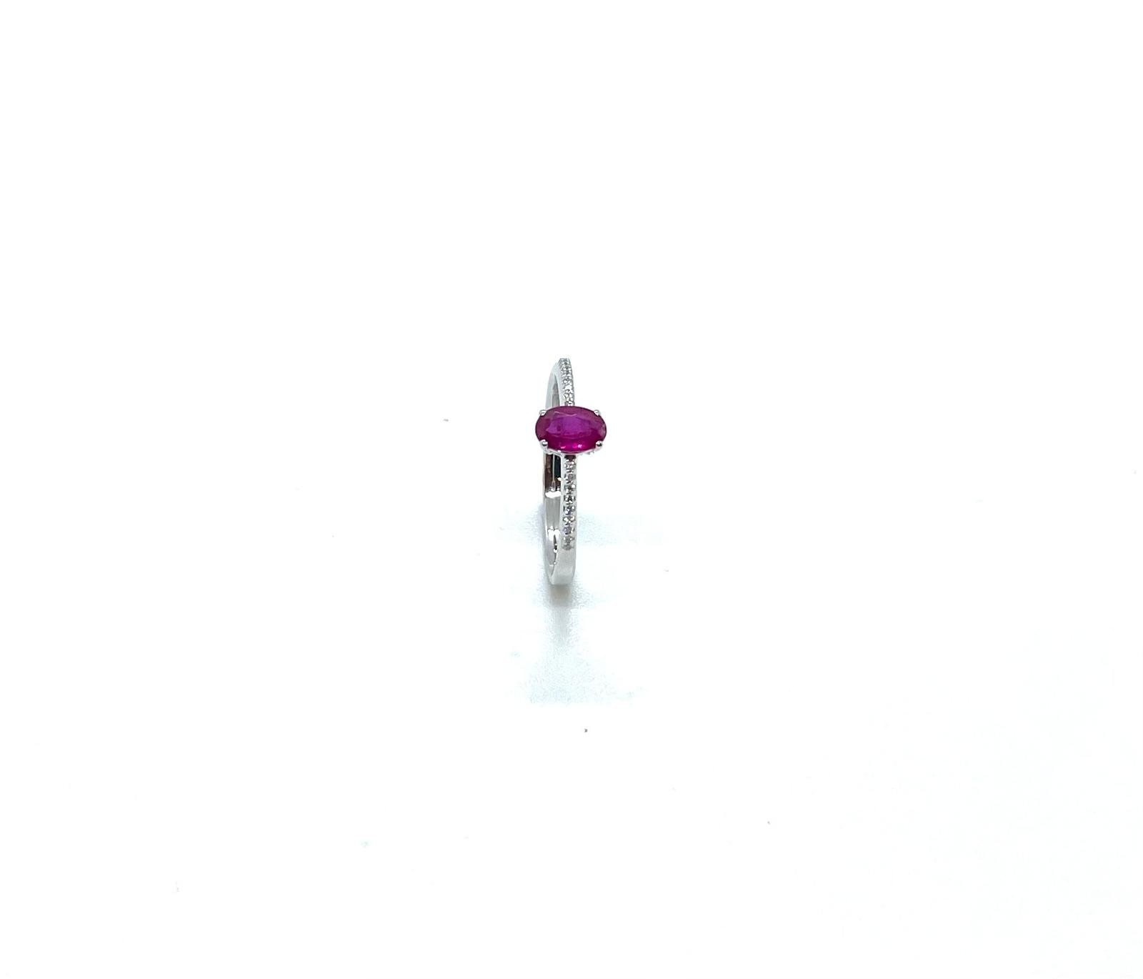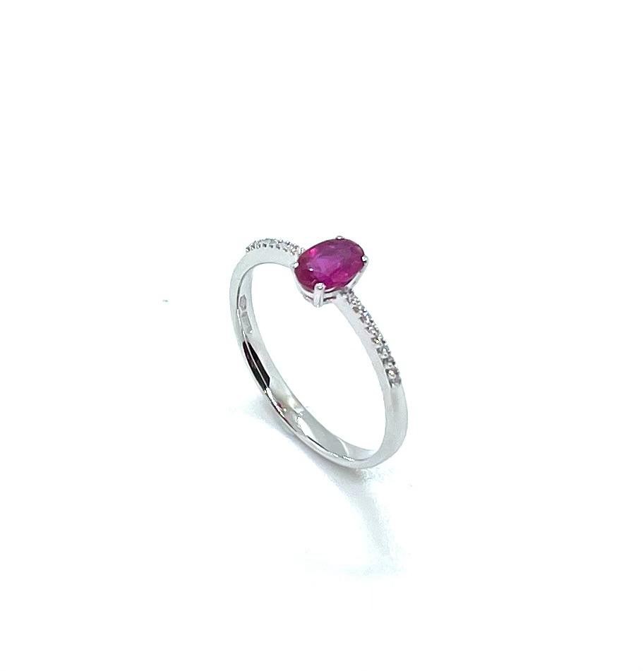 El braç de l’anell està adornat amb diamants naturals talla brillant amb un pes total de 0,18 quirats, que aporten llum i contrast, ressaltant encara més el color intens del rubí. La combinació de l’or blanc amb els diamants crea una peça refinada i atemporal.