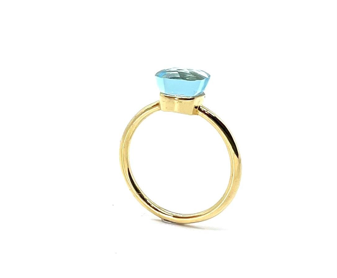 Elegant anell d’or blanc de 18 quirats amb un disseny sofisticat i ple de llum. La peça està protagonitzada per un espectacular topaç blau natural talla trillion, que destaca pel seu color intens i la seva forma triangular moderna.